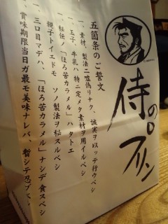 ダンナ様のおみやげです。 最寄り駅に1ヶ月期間限定、月替わりでスイーツを売るお店ができまして。 今月は「侍プリン」だって。 いろんな種類があるのが楽しい♪ 全体的にかなり甘さ控えめでしっかり苦いカラメル、好みです(^_^)v 北海道のお店で、首都圏にはあと羽田空港にお店があるくらいとか。 2月は短い、さっさとリピートしようと思います。