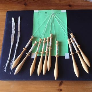 ボビンレースは織りのレース、糸巻きのボビンを動かすことで模様を織っていきます。