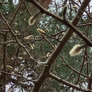帰りに大通りに植えられている植物たちを見ながら歩いていたら、大きなモクレンの木にたくさん新芽がついていました。