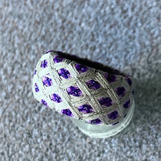 先生のお手本がとても素敵で、私はアメジストのルースに見えるような色にしたいなあ、と思って紫の糸でかがりました。