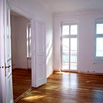 間違い探しです。下の写真、左右で異なる部分はどこでしょうか?撮影角度(高さ)や距離の違い、微妙な明るさの違いは見逃して下さいね・笑さて早速答えを明かしてしまいますが、一番わかりやすい部分は奥の部屋の壁色ですね。左の様に白だったものを、黄色に変えました。そして、もともと黄色だった手前の部屋も、トーンの違う黄色に塗り変えてあります。※先日のブログ記事の黄色です※更に、2つの部屋の境にある開き扉に注目してみると、ドアへりの部分に違いが見えるかと思います。左の写真では黒く傷が付いているへり部ですが、右ではそれが綺麗に無くなっていますね。実はドアのへりのみでなく、至る所が傷だらけでした。ここは、100年を超える歴史を持つ文化財指定のVilla(ヴィラ)のひとつ。詳しく言えば、時は1891年、初代家主のWilhelm Rungeという方の希望により建てられた古典主義様式の建築。このような建築はWiesbadenでは珍しくなく、以前ジャパンデザインネットで執筆させて頂いた様に街中に数多く見られます。※ジャパンデザインネット、Wiesbadenの建築執筆記事はこちら※そしてそれらの多くはリノベーションを繰り返され良好な状態を保っているものの、私たちのお引越し先はあまり芳しい状態ではありませんでした。ドイツでは、大家さんよりも住民にリノベーションの責任がある事が多く、お引越しでの退去時にする場合と、入居時にする場合との契約があります。この家は、入居時のリノベーションが必須。丸ごと自分の好みに変えられるのが利点とは言え、状態がよくない場合には大変な作業になるのです。そこで、傷だらけの各部を修復する為これらの道具が登場しました。こうして傷を埋めながらドアや窓枠を始めとする木製部分に全てやすりをかけ、その後ピュアホワイトへと塗り替えています。(まだ完全には終わっていません・・・)こうする事で、壁の色とのコントラストが効き双方を引き立たせられます。ピュアホワイトを塗る前は、白は白でもに薄汚れた白になっていました。中央の扉の白と、左右の窓下の白を比べてみて下さい。(左右の窓枠も数日後には真っ白になる予定です)『白』の明度が高くなる程、光の反射率も比例して高くなります。少しでも多くの光を家の中で拡散させるには、この比例が役に立ちますね。けれどもピュアホワイトの多用で冷たいイメージになり過ぎない様、白であればオフホワイトやアイボリーをどこかへ加えて調節するのもお勧めです。さてさてこんな感じでリノベーションが続いていますが今後も実際の部屋を実例に挙げながら、『色とインテリア』のお話をしてゆけたらと思っています。ゆっくりペースの更新になりそうですが、どうぞ引き続きお付き合いくださいね♪≪スパム系が多い為、現在コメント欄を閉じています。宜しければMailboxやMixiにてコメント等を頂けると嬉しいです☆≫※おまけ※青のポロシャツを着てバスルームを水色に塗っているのは、私の職人師匠(笑)Mark。私と夫のJuianは、紙製の作業着を着つつも何故だか全身ペンキだらけに?!又、ここでは梯子で遊んでいる様に見える私ですが職人仕事には、Markに太鼓判を押してもらえました♪彼のお墨付き『女職人』の誕生です!(笑)