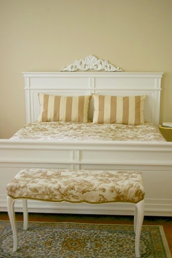 寝室の壁の色をご覧頂き、コンセプトは『ミルクティー色xシャンパン色xシュガー(白)』とお伝えしたのは既に一年半前の事でした。(え?そんな前?!汗)お部屋はとうに出来上がってはいたもののその後の様子をなかなかブログでUPする事ができず、ここへ来てようやくのご紹介です。寝室ですので、メインは勿論ベッド。トップの画像で見られるように、Toile de jouyのベッドカバーにストライプのクッションを合わせて引き締めています。※クッションはこちらの記事の終わりに出てくる布。※Toile de jouyについてはデザインウェブでの執筆をご覧下さい。それでは全体像、まずは扉から覗き込んだ感じでのアングルから。次に縦バージョン。そして少し角度を変えて。(右側のクローゼット《白》が写りこむように)さてここで、色のコンセプトについてお話をしますね。☆ミルクティー:壁の色、Toile de jouyの柄の色。クッションのパイピングの色等。これらは『トープ』や『ベージュ』という表現でも表せられる中、下記の理由によってあえて”ミルクティー”としています。☆シャンパン:カーテンやタッセルの色をシャンパンゴールドにした事に上乗せし、実際はブラウンゴールドと呼ぶほうが適している椅子やアンティークランプも全て含めて”シャンパン”としてしまっています。☆シュガー:ハイ、単に、白です。笑寝室の家具はすべて白、もともと白でなかったものは、すべて自分で塗っています。このコンセプト、普通に『ベージュ×ゴールド×白』とも言える所、あえて『ミルクティー×シャンパン×シュガー』と呼びました。何故かと言うと、その方が響きがキャッチーだから。広告のキャッチコピーが良い例ですが、「気を、注意を引くような呼び方にして、実物を更に魅力的にみせちゃおう」という魂胆。(魂胆ありなのね・笑)加えて、この呼び方によって自分自身が遊び心一杯にデコレーションを進めてゆけるという理由もあります。さてこの空間、一段落はしているものの実はまだ未完成。南仏で手に入れてきた『天蓋』をつけ、ようやく完成!となる計画であります。また折を見て、寝室の裏舞台(DIY、Make overの様子)をご覧頂こうと思っています。天蓋も、それまでにつけられていれば良いのですが、そうでなければ経過報告をしてゆきますね!お楽しみに~♪