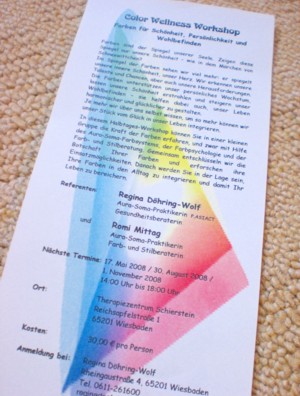 本日は2つのお知らせがあります。★お知らせその1今年度のドイツ語にてのワークショップ、日程が決定致しました。5月17日、8月30日、11月1日の3回を予定しております。5月17日は最終決定ですが、他の日程は変更の可能性あり。プロスペクトの表と裏は、こんな感じで出来ています。裏に載せている写真は以前新聞取材があった時のもの。このワークショップは、ドイツ人のパートナーであるオーラソーマプラクティショナーの女性と一緒に開催しているもので、14時から18時まで約半日のものになります。(いつも矢の様に時間が過ぎる半日です)オーラソーマのボトルとパーソナルカラーのシステムを用い、内面と外面両方から『色の作用』をたっぷりご体験頂く内容ですので、ご興味がおありの方、又は周りにご興味のありそうな方がいらっしゃる際にはどうぞお問い合わせ下さいね。(ドイツ語のみ、日本語通訳無しです)★お知らせその2誠に勝手ながら、引越し作業の為に4月、5月一杯の個人コンサルティング・セッションをお休みさせて頂きます。お引越しと言ってもヴィースバーデン内なのですが、その間リノベーション等に時間を費やしたい存分です。ドイツでのお引越しは、リノベーションに関する契約やキッチンに関する事情などが日本とは大変異なり、好奇心一杯で楽しんでいる所。今後私も職人さんと一緒に自ら携わって行きますので(自主的意志)、その際の”リフォーム/リノベーション”、『色』を中心としたリポートをこちらのブログでお届けしようと考えています。ビフォーアフターの写真等も含め、『お家改造!?ドイツ偏!』をどうぞお楽しみに♪************************************又、コンサルティング/セッション一時休業の告知が遅れました為、ご予約のご連絡を頂きながらご迷惑をお掛けしてしまった皆様にはこの場をお借りして再度お詫び申し上げます。6月以降、再開のお知らせまで、どうぞお待ち頂けましたら大変光栄です。いつもご愛顧頂いております事を、心より感謝致します。************************************
