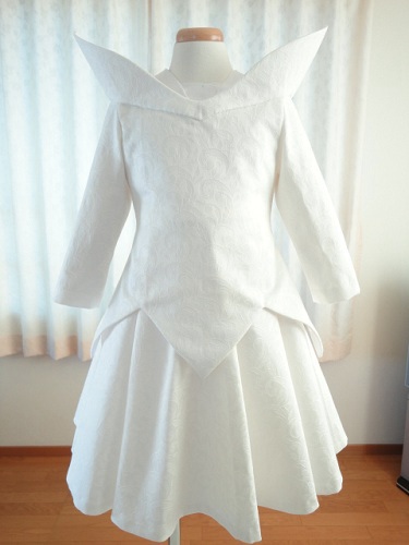 ブラウスはAラインワンピースドレスのパターンを利用して、裾をギザギザにカットして見返しを付けています。スカートはミディ丈です。立ち衿はドレスのVネックラインを利用して作図しています。このパターンのアレンジの仕方を載せますので、お作りになりたい方はもう少々お待ちくださいませ。本当は本の発売と同時に掲載すべきところをなかなか作業が進まず、遅くて申し訳ありません。我が家の80cmサイズのトルソーなのですが、前にも書いたかもしれませんが70~80の兼用サイズです。そのため肩にパッドを付けて肩幅を調整し、バスト辺りに布を巻いてバストサイズを調整してあります。ところがこのトルソー、ウエストだけはやたらサイズが大きいんです。専門学校の子供服のテキストやJIS企画の資料を見ても、80サイズの「腹まわり」は45~46cm程度。それなのにこのトルソーはお腹ぷっくりの幼児体型の可愛さを強調するためなのか、お腹がやたら出ていてウエストが49cmもあります。そのためこのブラウスもお腹の両脇にゆがみが出てしまっていますが、普通のお子さんならこんなにはならないと思います。お子さんのサイズを測って、サイズ表よりお腹まわりが大きいようならP.3の「型紙補正」で、パターンを直してください。袖は、Aラインワンピースドレスのパターンそのままで作りましたが、グリーティングのオーロラ姫の袖口はV字カットです。V字にしたい方はレッグオブマトンスリーブの下袖の袖口を参考にしてパターンを修正してください。楽天に書いてくださった方へお買い上げありがとうございました。おそらく私の本を買ってくださる方は、おゆうぎ会の本と同じような感じでキャラクター服がたくさん載っている本だと思って購入なさる方が多いのかも知れません。服の種類の点でご期待に副えず申し訳ありません。カラーページに関しては、この本は書店販売でなくネット販売を主体にする予定でしたので購入者のほとんどがネット利用者という前提で考えております。なので作品の細部や後ろ写真、作り方の工程をカラー写真で紹介するページはサイトで見ていただくことが可能だと思い、このようなページ構成の本にしました。初心者の方をないがしろにしたつもりはなく、初めての方向けの簡単な作品も載せておりますが、初心者向けの本や基礎を解説した本はたくさんあるので、私の本で同じようなことを書いてもあまり意味がないと考えました。ソーイングを経験なさった方ならおそらく、パフスリーブのワンピやAラインのワンピ位は手順さえ確認すれば解説を読まなくても服を作れると思います。他の本に書かれていない事、分厚くて値段も高い専門書に書かれているようなことも少し噛み砕いて載せられたら、ご自分でサイズ変更をしたり製図したりパターンをアレンジしたりという、服を作る上でのステップアップのお手伝いが出来るのではと思いました。また、今後はサイトで写真説明を加えていき、初心者の方にも分かりやすく解説して参ります。ともあれお気に召さなかったようですのでお詫びいたします。申し訳ありませんでした。ご意見ありがとうございました。