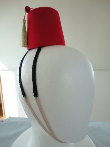 カツラをかぶるならカツラに固定できるけれど、今回モデルさんには地毛にあのちっちゃい帽子をかぶっていただくことになるので、その固定方法はちょっと頭を悩ませておりました。結果、頼ることにしたのは「帽子ゴム」。でも普通の帽子のように、ゴム1本の両端を帽子につけただけでは心もとない。なのでゴム2本で4点支持にしようかと。ゴムは1本を耳の前、1本を耳の後ろに通せばどうかしら。そして、あごまわりのゴムは肌色、頭のあたりのゴムは黒にして目立たなくしてはいかがでしょーか。 なんかものすごく面長ね、このヒト(^^)帽子の裏面です。帽子の後ろ(写真下)の赤いヒモのループは、ヘアピンを通せるようにするため。ゴムは片側(写真左)は帽子に縫い付けてありますが、もう片側(写真右)は仮留め(白い糸)にしました。モデルさんにかぶってもらって、ゴムがキツいと首が苦しかったら申し訳ないので、当日、安全ピンで調整できるようにしました。さて、これでちゃんとかぶって固定できるかな。ターバン、依然として苦戦中・・。
