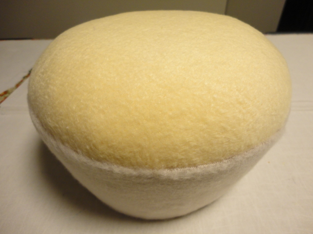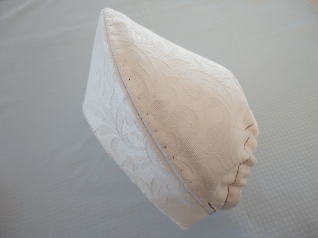 いやぁ、苦労しました。トップの丸みを出すのと、サイドに巻かれた布のドレープを作るの大変でしたぁ。このヒダヒダが崩れてしまわないように、ヒダの見えないところをしつけ糸で縫ってあります。なかなか自然な曲線にならなくて失敗。 真ん中の月みたいなのはもう少し丸みを付ければ良かったかな~?(もう作り直す気力はない。)土台の厚紙、膨らみを付けるスポンジとワタ、でこぼこを滑らかにするためにフリース、表地となる2WAYのストレッチ生地、という4重構造です。スポンジは、家にあった工作用のスポンジの在庫を寄せ集めて両面テープで貼りあわせました。足りなくてこま切れになってしまった・・。布をかぶせてから気が付いた。掃除用のスポンジのストック、使っちゃえば良かった(^^;モデルさんの頭囲に合わせて作ったけれど、かさばって重いし不安定な形なので、頭にちゃんとフィットしないとかぶり辛いと思って、内側にキャップの形の裏布をつけました。これもやっぱりアゴに帽子ゴムをつけたほうがいいかな?シャバーンのローブ(と、呼ぶことにしました(^^)♪)は3日で出来たけれどこのターバンっぽい帽子には5日くらいかかりました。サイズさえ合えば、一度だけじゃもったいないからハロウィーンの時に自分でかぶるのに(^^)もう説明するのもしんどいので、写真だけです。苦労を読み取ってくださればそれで(^^;