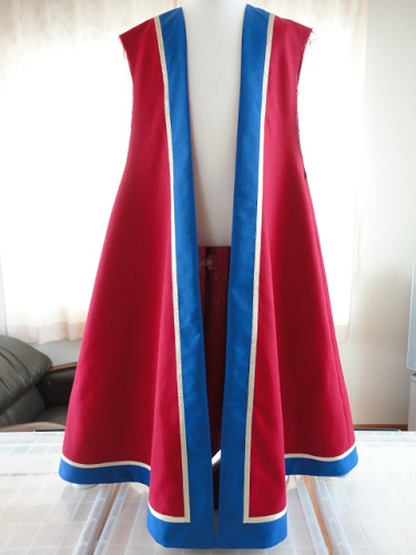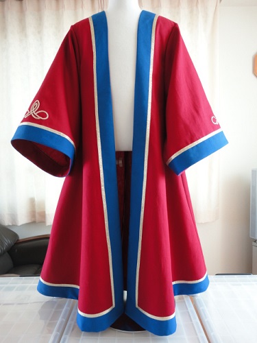 あとは袖だけ~~(^^)v でも袖に模様があって、それを作るのがすごく手がかかりそうなんだけどね・・。頑張るぞ♪全部とはいきませんが、工程写真を少し載せますね。ハロウィーンにシャバーンの衣装を作る方の参考になればいいなと思って。シャバーンのコートはもっと裾まわりが広くて、多分着ている人がくるっと回るとドレスの裾のようにふわっと広がるくらいだと思うのですが、あまり裾まわりが広いと服そのものが重くなってしまうと思うので、まぁこのくらいでいいかなーと。こういう服を作る布はある程度は厚みがないと服がしっかりしません。厚みのある生地で面積の多い服を作ると、それなりに重くなります。これ以上身頃を広げるには前身頃にも切り替えがいるかも。生地をたくさん使うとお金もかかるしねー。こういう金テープを綺麗にたたくのって結構難しいです。(たたく=洋裁用語。生地の上に、リボンやテープ、他の布などを置いて 縫い付けることを言います。)ヨレたり、端がガタガタになったり。こういう時は接着テープを裏に貼ると綺麗に仕上がります。今回は8mm幅の金テープのストックがあったのでこれを使ったのですが、裏に6mm幅のストレートの接着テープを貼りました。(接着テープにも布目があって、ストレート、ハーフバイアス、バイアスなどがあります。P.16参照)たたくテープ(この場合は金テープ)の素材にもよるのですが、アイロンの熱で多少縮むことがあります。接着テープを貼る前に、接着テープを貼る温度のアイロンで、一度金テープにアイロンをかけてから接着テープを貼ったほうが綺麗に貼れます。接着テープを貼ってから、更に5mm幅のアイロン接着テープを貼り、青い生地の上にアイロンで接着し、透明糸でミシン縫いしてあります。透明糸を使うのは、色を金テープに合わせられるというのもあるのですが、裏側のエンジ色の布に縫い目が出てしまうので、これに金色の糸では縫い目が目立ってしまうため。シャバーンのコート(ジャケットというには丈が長すぎると思うので、私はコートと呼んでますが、実際はなんて呼ぶべきなんでしょうね・・)は、前述のように裾まわりが広いです。マントのようにふわっと広がり、実際にシャバーンが勢いよく向きを変えたりするときには前がめくれたりします。だからマントと同じように、裏側が見えてしまうことも考慮に入れて作らなくては。前身頃に見返しを付けるにしても見返し幅が数cmでは足りない。でもあまり見返しの幅が多すぎると、丈が長いだけに服がさらに重くなってしまいます。子供の服にそれはなるべく避けたいので見返し無しで作りました。多分本物も同じなのでは。それとも全面に裏地を付けているのかな?写真だとちょっと分かりにくくて。前身頃の前端や前後身頃の裾の縫い代は、青い布と縫い合わせて端の処理をします。青い布には接着芯を貼ってあります。前後身頃の裏面と青い布の表面を合わせて端を合わせ、出来上がり線の0.1cm縫い代側を縫います。(縫い代は1.0cmなので、端から0.9cmのところにミシンをかけることになります。)ここでご注意。普段「ナカオモテ」で縫うことに慣れていると、ついナカオモテをやってしまいがちですが、この場合はエンジ色の布の裏面と青い布の表面を合わせます。)ミシン目が見えるところを折ってアイロンでよくクセづけしてひっくり返します。形を整えたら、端から4.0cmのところ(このサイズの場合の参考寸法です。)にチャコでシルシをつけます。金テープを縫い付ける位置です。アイロン台の上にのせて、シルシに合わせて金テープを置き、シルクピンを刺して固定します。あて布をしてアイロンをかけて接着します。アイロン接着テープも幅が5mmくらいだと接着する力は弱いので、ところどころピンで留めておいたほうがはがれにくくてミシンで縫う時に安心です。前述のように透明糸で金テープの両端を縫います。透明糸はどんな生地の色にも合わせられて便利なのですが、難点は糸端。縫い終わった後の糸の処理をキチンとしないと、特に首周りなどで直接肌に触れるとチクチクします。玉止めしたら糸を手縫い針に通して、縫い目に丁寧に縫いこんで(P.6右下のダーツの糸処理と同じ。)肌に触れる面に糸が出ないようにします。袖が出来たらまたアップしますね~~♪