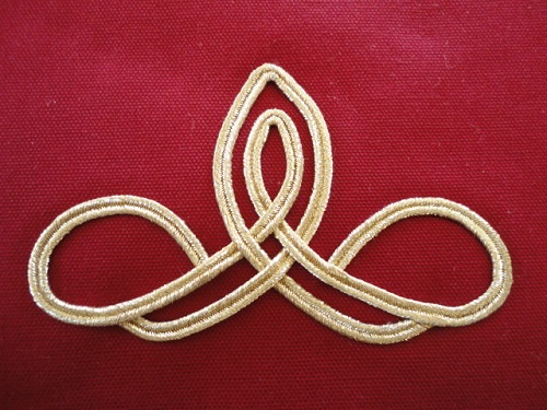 袖付けも終わったんですけど、昨日の夜、完成した時には暗くなってしまったのでまた今日にでも服の全体写真撮って載せますね。そうそう。こういうのはコートじゃなくて「ローブ」でいいのかしらね。「バスローブ」とかのローブ。ヤフーの辞書によるとローブとは 1 ワンピース仕立てになった裾(すそ)の長いゆるやかな婦人服。 2 裁判官や欧米の僧侶が用いる長い上着。法衣。だから、2に相当するような。でもシャバーンの肩書きって?マジシャン?ま、いっか。袖口の模様というかマークは、本物はミシン刺繍かしら。ウチにはコンピューターミシンなんてないので、こんな刺繍は無理。なので金ヒモを生地の上に置いて裏から縫い付けて模様を作りました。アラビアのデイジーの服を作った時に使った金ヒモが残っていたので、それを使用。(思い出すだけで身の毛もよだつデイジーのあの模様!詳しくはディズニーページのアルバムP.37を見てくださいね~~♪)この金ヒモは実に優秀で、かなり強いカーブにも対応してくれます。ドコで買ったのか忘れてしまったけど。多分オカダヤさんかユザワヤさん。弱点はカットした先端がほつれやすいコト。なので切る前の下処理が大事で、透明糸で切る位置を縛ってから、瞬間接着剤を切る箇所にしみこませ、充分乾燥させてからカットして使いました。なので一度模様に合わせてヒモを形づくり、長さを決めてから「透明糸」と「接着剤」の処理をして、時間をおいて乾かしてカットし、また形を作るという面倒な作業をしました。裏面には5mm幅のアイロン接着テープをさらに半分に切って貼ってあります。このマークは、シャバーンの衣装を撮った写真の中で、マークを比較的正面から撮ることができたものを拡大コピーしてトレーシングペーパーにトレースして形を整えて図案にしたものです。もしかしてハロウィーンで衣装を作る方がお使いになるかしら? もうちょっと綺麗に描いたものをスキャンして今度載せますね。「まったく同じ」というワケにはいきませんが。袖の布に金ヒモを置いて縫い付けるのですが、こういう時もこの部分の布がしっかりするように、接着芯を裏面に貼ったほうが綺麗に出来ると思います。マークよりひとまわり大きな形を描きます(右下)。マークの外周より5mm外側に線を引いてあります。これを接着芯の型紙にします。この時の接着芯は不織布の薄手接着芯(左上)を使いました。形がくずれないのと、切っても端がほつれないので。これは袖の裏面です。接着芯を貼ってある上にマークの図案を置き、「貼ってはがせるテープ」で固定します。袖の布の下にチャコペーパーを置いて、ルレットで線をなぞり、袖の表面に図案を写します。表面です。表に印を付ける時は、あまり目立つ色でなくチャコペーパーは同系色で。アイロン台の上に、袖を表面を上にして置いて、剥離紙をはがした金ヒモを図の上に少しずつカーブをつけながら形を作り、ピンを刺して留めていきます。あて布をして、アイロンで接着してはピンを1本ずつ抜き、またアイロンをかけて接着し・・を繰り返して、金ヒモ全体を布に貼ります。ヒモの端が抜けたりズレたりしないように、ヒモの端の4箇所を固定するように糸で縫って、裏側でしっかりしばります。そのあと、金ヒモ全体を布に縫い付けます(表面:写真下)。すべて縫い付けた後は、糸の縫い目(裏面:写真上)を隠すために、最初に貼った接着芯と同じ大きさのものをカットして(右)、最初に貼った接着芯の上に貼ります。マークが出来たら、袖下を縫って筒状にして、袖を身頃に付けます。あとはターバンだっ!頑張るぞ♪