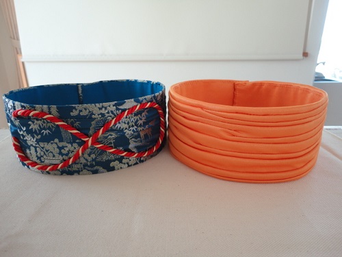 こういうのって何ベルトって言うんでしょうねー。アラジンやジーニーも同じ様なベルトをしていますよね。こういうのを作る時は厚紙で土台を作って上に布をかぶせて作ってます。ベルトのどアップの資料写真は撮れなかったので、ハッキリとは言えないのですが、シャバーンのベルトはどうやら規則的な折り目がいくつかついていて、真ん中にあるねじねじの紐の先端がその折り目に挟みこんであるみたいです。生地は、私が探した中ではこれが一番似ていました。青地で何か銀色っぽい模様があって。これはチャイナブロケードっていうのかしら。チャイナ服を作るための生地かな。高いのよ~~。メーター2300円もするっ!本当は伸びない生地でこういうものを作る時はバイアスで取ってベルトの丸みに生地が沿うように作りたいんだけど、バイアスで取ると多分70cmは必要になる。とてもとても!そんな金額出せないので、必要最小限の20cm購入。アシームのオレンジの生地のほうは、伸びる生地にしました。これも高い。メーター1900円。これも必要最小限の20cm購入。でも伸びるのはいいけど、縫いにくいの~~。私のミシンは古いから、こういう生地を縫うとすぐに針目が飛んでしまう。木綿をバイアスで取れるように70cmくらい買っても値段はあまり変わらなかったかも。そして木綿のほうが当然のように縫いやすかっただろうから、ちょっと考えモノですね。アシームのベルトのシワは、どうやら規則的ではないみたい。でもこの「アトランダム」ってやつが結構難しいのよね。規則的にならないように裏側からミシンをかけてシワを作りました。生地のシワが出来たら、厚紙にかぶせて裏側に折り込み、布用の両面接着テープで貼りました。ベルトよりもひとまわり小さい裏布を裁断してピン打ち。端をまつって裏から見ても厚紙が見えないようにします。青生地の柄は、もみじとか鳥とか五重塔(?)とか。鹿の胴体切断をしてしまった・・。こんな目立つところに。布を裁ったあとで気が付いたのよね。ああ、罪つくり(^^;