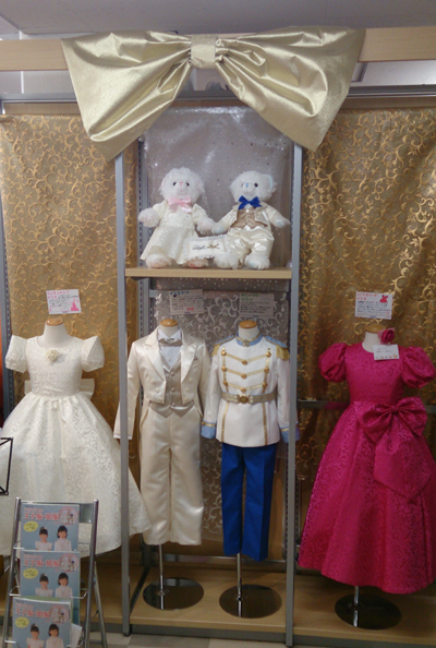 「子供のための王子服・姫服」の表紙の男女の服、裏表紙の男女の服の計4着と、ウエルカムドールとしてぬいぐるみのウエディング服、リングピローをオカダヤ町田店さんに展示していただけることになりました。「ブライダルフェア」のような感じで、リングボーイやフラワーガールのイメージで展示していただきます。そばに私の本も置いてくださるそうです。オカダヤさんは大好きな生地&素材屋さんで、私はよく新宿店さんに買い物に行きます。本に掲載した服の生地も、ほとんどがオカダヤさんで購入したものです。町田店さんは行ったことがなかったのですが、新宿店さんよりもお子さん持ちの方がいらっしゃることが多いそうで、子供服の展示は町田店さんのほうが向いているということのようです。ママさん達が衣装作りに興味を持ってくれたら嬉しいなー。お客様が「作ってみようかな」と思う創作意欲を呼び起こせる、そして服を作るための生地を買おうという購買意欲を持っていただける。私の作品がその効果をもたらせるという判断をしていただけたということだと思うと、それがとてもとても嬉しいです。この写真は、私がトルソーに着付けをしただけの段階です。このあと、本を置いてくださって本の紹介のパネルを置き、トルソー1体ずつに服を紹介するPOPを付けてくださり、壁面も布などで飾ってくださるそうです。お近くにお住まいの方、オカダヤさんにお寄りになったら是非3階の展示をチェックしてくださいませ♪