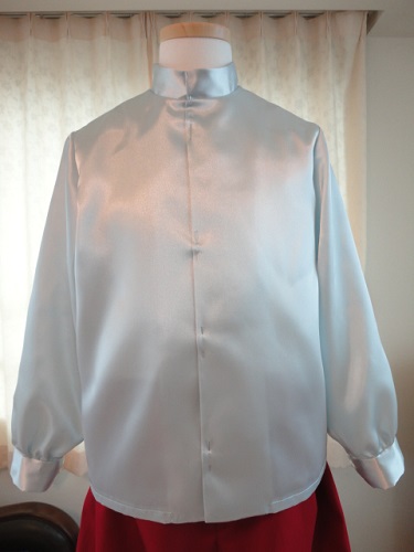 シャバーンのシャツ、大体出来ました。120cmサイズのシャツを110cmのトルソーに着せているので、ちょっとシャツが大きめですね。下にあれこれ補正を加えてはおります。本に掲載したプルオーバーシャツの型紙を利用してアレンジしました。前身頃には前中心に1.5cmの持ち出し分を加えて前あきにしました。スナップをつける予定です。衿ぐり線は型紙通りで、衿ぐりを測ってスタンドカラーのパターンを作りました。スタンドカラーのパターンの作図の仕方はP.32に書いてあります。袖は、本に載せたシャツと同じようにカフス仕立てにしました。撮った資料写真ではよく分からないのですが、おそらくシャバーンのシャツはカフス無しの長袖だと思います。でも上に着ている、パンツと揃いのコート(?長ジャケット?)の袖口から、シャツの袖がズルズル出てしまうよりも長さの調整がしやすいと思って、カフスで作ってみました。袖口のあきは、ちょっと手抜きして袖下の縫い合わせにつけました。ホントは1枚袖の場合、袖下の位置じゃいけないんだけど、まぁ見えないトコだし(^^;ちょっと急いで作る必要のものが出来たので、しばらくシャバーンとアシーム休みます。ターバン・・丸メガネ・・コートの袖の模様・・。難題がいっぱい。春休みまでに出来るかな~~?楽天に書いてくださった方へ高い評価をしてくださってありがとうございました。「洋裁の参考書のよう」というもったいないくらいの素敵なお言葉をいただき、光栄です。ありがとうございます。写真が少ないことは本当に申し訳ないのですが、本で出来なかったことをフォローし、掲載作品のアレンジなどを増やし、買ってくださった方のお役に立てるようにしたいと思っています。本だけでは初心者の方には理解不能なところも多々あるかと思います。サイトとmixiで今後も写真を増やしていき、説明を加えていくつもりです。 >>とても 丁寧な内容で この内容で この値段は お安いかも・・・そう言ってくださるとほっとする思いです。写真よりも「型紙3枚」が譲れなかったので。 >>お遊戯会で 簡単に服を作りたい人は その程度の本を買うべし。私の本はどうしてもお遊戯会の本と同様の本だと思われてしまいがちです。お遊戯会本のようにあんなに作品の種類を載せても結局、実物大型紙でなく製図が多くなってしまったり、サイズの展開が少なかったりして、型紙が欲しい人には不親切かなーと思っていたので。それよりも作品数はしぼってでもサイズ展開を増やしたほうが、キャラクター服を作る方たちには利用価値があるのではと思いました。でもお遊戯会本はまさに幼稚園の子供のサイズをフォローしているし、たくさんの種類を載せてあったほうが役に立つ。コンセプトがまったく違うものなので、そこを明確に書いてくださって助かりました。嬉しいお言葉をいただき、ついたくさん語ってしまってスミマセン。ともかく、とても嬉しいレビューでした。ありがとうございました。