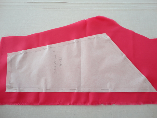 前回書いたように、リボンの作り方の写真は途中から削除してしまいました。でもリボンの足の部分の作り方はだいたい残っていたので、それだけでも載せます。途中までですが、リボンの足に裏地を付ける時のコツとか、型紙作りの手間を省く方法をご紹介しますね。リボンの足(3サイズ、実物大型紙を掲載しております。)も衿と同じように、ナカオモテで縫って表に返したときに裏布は0.1cm控えたほうが綺麗な仕上がりになります。生地が厚手でなければ、表も裏も同じ生地でOKです。表地によっては、裏布の生地は裏地を使ったほうが厚みがおさえられます。裏布を0.1cm控える時は、表布と裏布は縫い代の幅を変える必要があります。でも両方とも型紙を作るのは面倒。そういう時はルレットで。これは表布の型紙です。表布の縫い代は1.0cm。型紙通りに裁断します。表布の型紙を裏布の裁断に使います。2枚合わせた裏地に型紙をシルクピンで留めます。裏布の縫い代は0.8cmにしたいので、紙の端から0.2cmのところに定規を当ててルレットで印を付けていきます。裏側です。まだ型紙はピンで留めた状態です。ルレットでつけた印が見えにくかったらさらに裏側からもルレットでしっかり印をつけます。裏地2枚がズレてしまわないように、ルレットで印をつけたまわりをピンで留めます。型紙をはずして、ルレットでつけた線をハサミで裁ちます。これで1つの型紙で表布も裏布も裁断が出来ました。表布は接着芯を貼ってあります。上の縫い代(1.0cm)をアイロンで折っておきます。上以外の三辺に、アイロン接着テープ(0.5cm幅)を接着し、剥離紙をはがしておきます。表布と裏布の端を合わせて、アイロンをかけて接着テープを貼ります。裏布のほうがひとまわり小さいので、裏布が張っていて少し反り返った状態になります。袋の上の縫い代です。表布は弓のようにたわみ、裏布はピンと張った状態です。ミシンで出来上がり線を縫います。袋の口は、出来上がり線(青ピン)より0.1cm下がったところ(ピンク)が縫い止まり。返し縫いをします。表布側に縫い代を折ります。ミシンで縫った線が見えるように、出来上がり線のきわをアイロンで折ってよくクセをつけておきます。写真はここまでです・・。あとは表に返して、裏布の端を0.1cm控えてアイロンで形を整えます。袋の口はミシンで縫います。消化不良でごめんなさい。またリボンを作る機会があれば撮りますね。