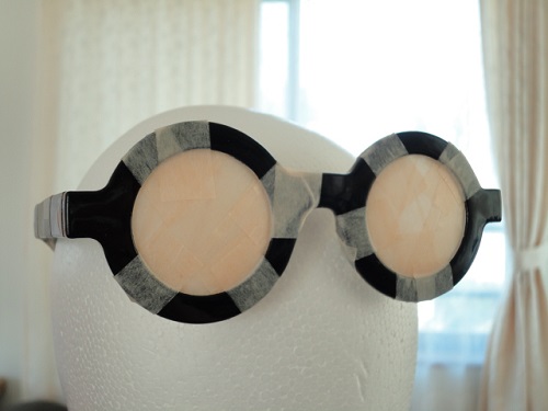 帽子、ほぼ出来ました。丸メガネ、見つかりました。アシームのメガネは黒と赤のまだら模様なので、これを赤のカラースプレーで色をつけなければならないのですが。 このメガネは大人用なので小学校1年生の双子ちゃんには大きいと思うのですが、写真を撮る時だけならまぁなんとかなるでしょう。本当はもっとフレームの細いのが欲しかったんだけど黒or赤の丸メガネが見つかっただけでもみっけもんですね。帽子は、少々裾広がりの円筒型。これの型紙を作るために前の上履きと同じようにあるモノにラップをかぶせて、セロテープでとめてマジックで線を書いて切り、型紙の元にしたのですが・・。今回土台にしたのは「そばの器」。ちょうどいい形と大きさだったもので(^^)。ラップを切りひらいてトレーシングペーパーに写し取り、それを使って紙で試作品を作ってから、型紙にしました。サイドクラウンになる部分は、型紙と同じ大きさの厚紙を土台にして、型紙よりひとまわり大きく切った布をかぶせました。こういう時の布は伸びる布でないと綺麗にかぶせることが出来ません。今回は家にあった綿ジャージを使いました。厚紙の内側の上と下に、布用の両面接着テープを貼って、布をやや引っ張り気味にかぶせて貼ります。この場合の両面接着テープは、アイロン接着用ではなく、普通の工作などに使う両面テープと同じですが、布用のもの。かなり強力に付きます。帽子の上の部分(トップクラウン)は少し丸みがあるので、厚紙を数枚重ねました。あいている2つの小さい穴は、糸を通せるようにするためです。厚紙を4枚、少しずつ大きさを変えて重ね、段差をなくすために接着芯(厚)を3枚ほど貼ったところで、「もう少し丸みが欲しいな」と思い、その上に接着フェルトを、同じように少し大きさを小さくしながら2枚重ねました。さらに接着芯(厚)を4枚ほど貼って、段差を目立たなくしました。厚紙よりふたまわり大きく切った丸い布をかぶせ、端をぐし縫いして縫い縮めます。穴から糸を通して、帽子の上に付ける飾りの紐の輪に通し、裏側でしっかり結びます。アシームの帽子についている飾りの赤い玉は、何か模様があるようなのですが、ハッキリと写っている写真がないので、何も手を加えず無地の赤玉のままにしました。約1.0cm直径のウッドビーズです。さて、この帽子をどうやってモデルさんの頭に固定するか。問題だ~。