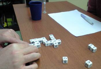 さてさて、長い冬休みを終えて再びスタートした英会話に行ってきた私です♪ と言うのも、講師の先生がアメリカに帰省していたり等で今日が今年初の英会話になりました。 ちなみに、今回は観光で使う言葉の勉強でした♪ そして、残り時間も少々となったところで「ゲームをやりましょう♪」って事に♪ それがコチラのゲームです♪ 何て名前のゲームかはわかりませんが、サイコロの数字の代わりにアルファベットが書いてあり、その目のアルファベット群を組み合わせて単語を作っていくゲームです。 このゲームは受講生連合チームvs先生での対戦となりました。 この写真は先生のチャレンジ中の模様です。 う~んこのゲーム、実に難しい! 何せ、単語やスペルを知ってなければダイスのアルファベットを並べる事が出来ないですし、逆に単語やスペルを思い浮かんでも使いたいアルファベットのダイスが無ければ文字は出来あがらず・・・。 苦悩と文字の出来上がりで心情が交錯して、みんな夢中になってました♪ 先生だってガチでしたもの(笑) 結果は先生の勝利でした! さすがに生徒には負けられんってプライドもあったようですが、このゲーム「ますます単語を覚えよう☆」って本気にさせてくれる感じでしたよ☆ こりゃハマっちゃうかも!? てな訳で、チビチビと辞書を調べて単語を覚えよう☆