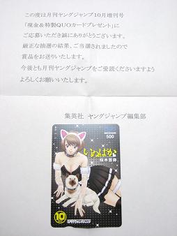 2009年一発目の当選品が届きました。 Thank you for 集英社500円分のQUOカードです。コンビニであっという間になくなってしまいそうです。月刊ヤングジャンプは、連載されてる「風が強く吹いている」が面白いので毎月買っているのですが「風が強く吹いている」って舞台化されてるんですね。 箱根駅伝の話なんですけど映像ならまだしも、舞台でって大変そう。しかも、「テニプリ」的臭いがしますよ。(偏見)と思ったら、映画も製作されてるんですね。そっちはチョット気になります。