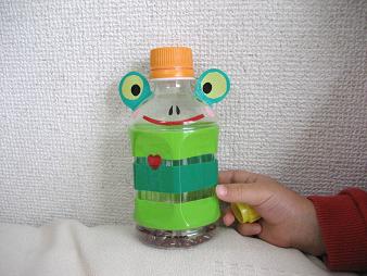 いつも行っている育児支援で簡単なガラガラのおもちゃを作ってきました。中には小豆が入ってます強度の関係なのか、ホット用のペットボトルを使いました。目の部分はカラーのガムテープ、それ以外はカラーのビニールテープです。私は御子が好きなのでカエルを作りましたがオレンジ系のテープでネコとかピンク系でブタさんとか作ってるお母さんもいました。キャップ部分が思いがけず帽子みたいになって可愛い。御子は喜んでくれたので良かったのですが思いのほか音がうるさいので、耳のそばでガシャガシャ振られると、耳がやられます帰りがけ、保育園の先生に「こういうの得意でしょ?」と声をかけられましたが…とんでもない私のクリエイティブな才能は小学校2年生の時に交通安全ポスターで警察か何かに表彰されたくらいがMAXでした