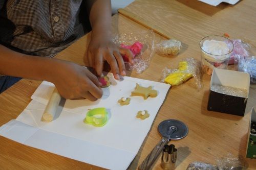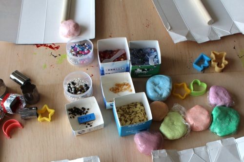 先週余った絵の具を練り込んで作ったカラー粘土を使って、お菓子の工作をします。頂き物のスイーツカップや緩衝材なども使ってみよう。型抜きに専念する子、別の色のカラー粘土作りをする子、興味のある作業は人其々…こちらスイーツカップ作りにハマりました。お菓子の家のベースになるかなと私が用意した段ボールハウスに窓やドアを追加しようと穴あけ中です。みんなが作った部品です。チョコレート色にこだわったね。色を重ねた後の切り口を面白がっていました。お菓子の本を見ながら忠実に再現してました。マカロンだそうです。クリームもちゃんとはさんでます。あっさり作ってますが、好きな雰囲気が出てますね。パワフル!男の子ですよ。持ち運びできるお菓子(≧▽≦)だそうです。綿でシュワシュワを表現しました。細やかなお菓子づくりにはあまり興味が持てない子は段ボールや箱などを使って、建物や乗り物を作ってもらってます。