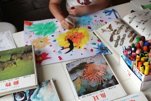 前回指で着色した画用紙に自由に絵を描いてもらいました。思いつきにくい人は図鑑を参考にしてもいいです。タイトルもつけました。「森のいきもの」「春の野原」「お菓子な宇宙」余った時間でプラバンで遊びました。こちらはマグネットで仕上げています。