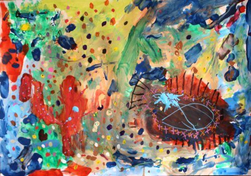 前回フィンガーペイントした画用紙に思いついた絵をペンで描き足しました。イメージが固まってきた人にはタイトルも考えてもらってます。「サンゴのさんらん」「ワンピース」「おじいちゃん」「りゅうおう」「めいろ」「きょうりゅう」時間が少し余ったので、フィンガーペイントで残った絵の具を使ってカラー粘土を作ったりプラバン制作をしたりして遊びました。