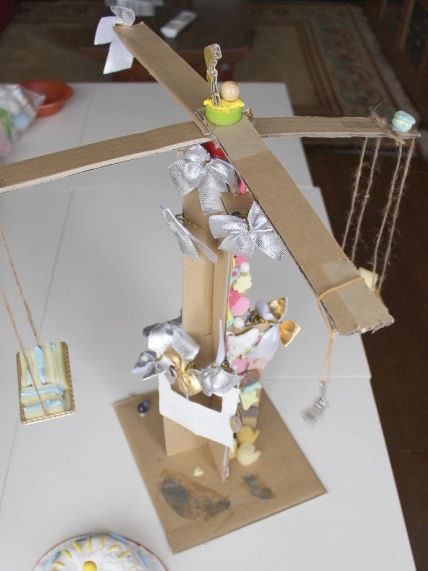 「お菓子の国」をテーマにお家やスイーツカップを作ってきましたが、ここに来てかなり自由制作になってきました。みんなの意見を取り入れた空中ブランコならぬ、スイーツブランコ。実際に回ります。何のサンドイッチ!?UFOケーキ。これもブランコに吊るす予定。こちらは個人作品で、家から何か広げて考えてますね。紫色の粘土づくりに没頭したり、お花を作ったり。家を馬車に見立てて、馬はペガサスになって、吊るすつもりなのでかな?先週から引き続きで、エレベータ追加。裏側もレンガを貼りました。おまけ。誰が作ったんかな。ハトメを使ってマリオネットにする約束をしちゃいました。お菓子の国は一旦終了。(続きは教室に来たときに自由にやってもらいます。)次回は草木染を予定しています。今回は初めて藍染めにも挑戦します。
