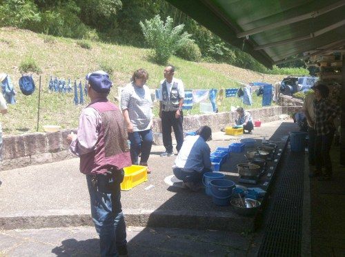 飛鳥里山クラブのクラフトサークルの定例会に参加しました。今月は草木染です。染料は藍の他に、茜、蘇芳、玉ねぎ、くちなし、桜、ヨモギ、ドクダミ、アカソ、ハルジオンなど今回は柄の付け方をいろいろ試してみました。空き缶に縫い付けて絞ってます。こんなかんじに。思ってた以上にはっきり出た。綿のお団子を縫い付けて染める「蛍絞り」うまくいったと思います。正三角形に折りたたんで「板締め絞り」締める向きを変えて2度染色しました。こちらは糸で絞り染めにしたのですが、あまり柄が出ませんでした。もうちょっと勉強しなくては。木端をクランプで挟んで染めてみました。ヨモギです。右側が上のミニタオル。左側のゴムで縛ったお団子は…古くなったTシャツを染めてみました。着古したものの方がタンパク質が付着してますので、染まりやすいです。綿ストールは以前に染めたものを染め直し。クチナシです。ホンマに楽しかった。帽子や手袋などちょっとした小物も染められる。みなさん、年中行事として生活の一部になっています。草木染めは秋にもやる予定。