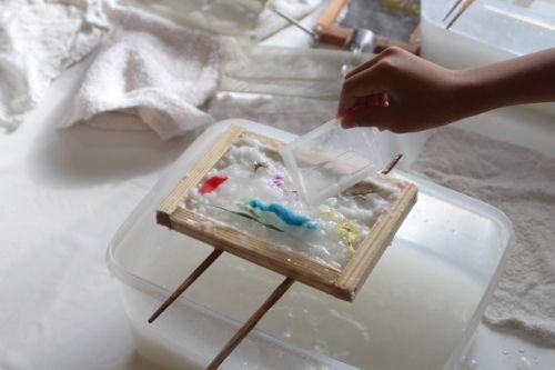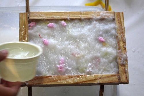 今日も紙漉きです。漉き込む材料です。香りが楽しめるラベンダー、パプリカや瓜の種、センニチコウ、アジサイ、お花紙、毛糸などの端切れ。今はエノコログサがたくさん生えてますね。小さいものが使いやすいです。