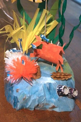 今日も海底ジオラマ完成させるよ~。イッカクという海の動物にこだわった作品。2年生男の子です。2年生女の子。一番素直な感じに仕上がったかな。分かりにくいですが、緑色のはカメです。土台は岩の感じがよく出ています。4年生。私も子どもたちと一緒に手を動かします。トイレットペーパーの芯で作ったジンベイザメとエビだ!他にもカニ、フグ、マンボウなど作って、「欲しい!」っていう子には鉛筆で線だけ描いてあげてます。カニは人気でしたよ。エビは作り込みすぎて、難しそうと敬遠されてしまいました。イッカクを作った子はジンベイザメをヒントに作ってました。