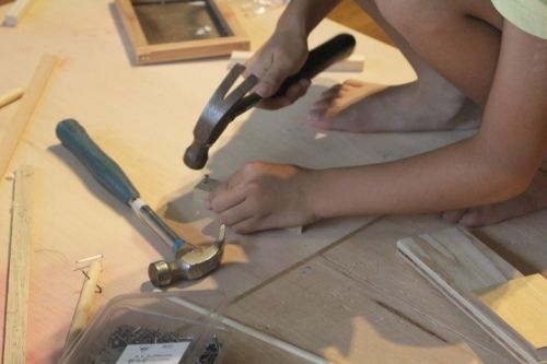 今日も紙すき用の枠を作るためのこぎりや金づちやら釘を出しております。他にも牛乳パックのラミネートを剥がす作業や、紙すき枠と共に使うネットのカットもあります。金づちと釘は練習も兼ねて遊んでいいよ~って言ったら、結局最後までずーっとやってる子もいます。木端の端を揃えてきれいに釘で留めてます。こっちは玉を転がすと、面白い音が出ます。木には木の球、釘にはビー玉が良い音がします。紙すきの原料となる牛乳パックは水煮するとラミネートが剥がれやすくなります。今日完成したパイナップル。6年生です。