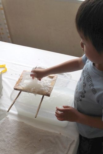 夏らしい課題をと思い、手漉き紙に挑戦しています。牛乳パックから取ったパルプはミキサーやプロセッサーでドロドロに砕き…水に放って漉き枠を使って紙にします。一人分のセットです。子どもたちの一番の難関は恐らく雑巾絞り。試作したときにそう感じました。小まめにタオルの水分を絞って、紙の水分を取っておかないと、網から外すときに破れてしまいます。枠は一応ハガキサイズなんですが、子どもたちは本当に自由なので、ハガキを意識する子は多分いないでしょう。ハガキだったら真ん中にオブジェは入れないもんね(^^)漉いた紙は取りあえず窓に貼っておきます。そこそこ乾いたらアイロンで仕上げます。1年生3年生2年生3年生水遊びができて、雑巾絞りが上手くなって、夏休みの宿題もクリア(提出物としては微妙だが…)最後におまけ。漉き込むために用意した毛糸を使って飾りを作ったのは3年生。片付け、掃除をしてくださいって言ってたんだけどなー(-_-;)紙漉きは図工の作品としても、自由研究のテーマにしても良い課題です。