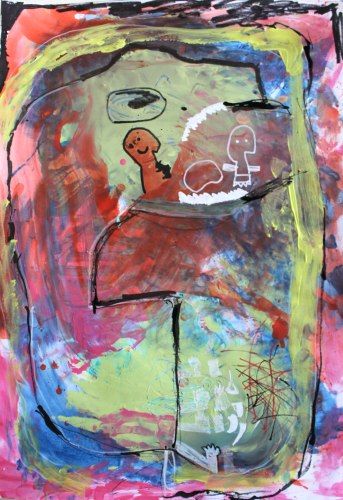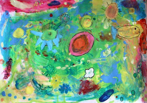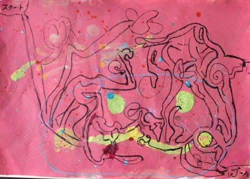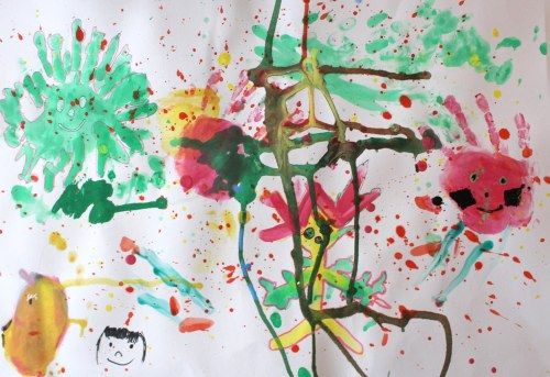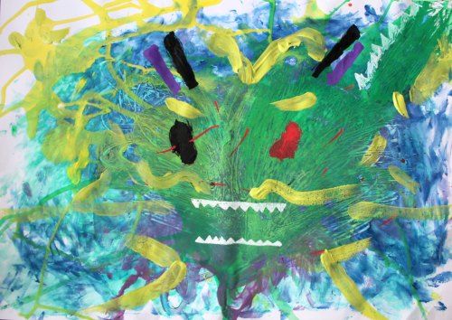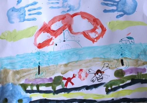 前回フィンガーペイントした画用紙に思いついた絵をペンで描き足しました。イメージが固まってきた人にはタイトルも考えてもらってます。