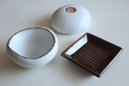 作家さんの企画展「赤部焼 松本尚・空見子陶展」をやっており、旅の印に買いました。おろし器は通常の商品で小鉢の方が作家ものです。とても厚みと重みのある器で高台がなくても安定して使えます。