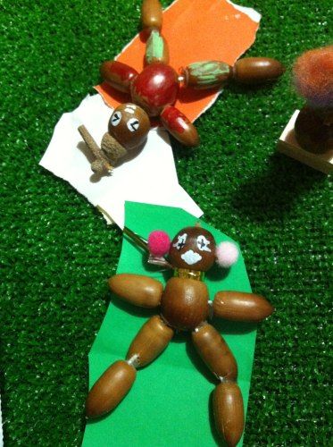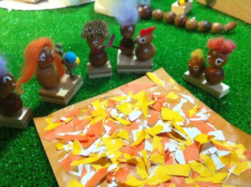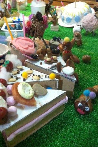 並べているうちにストーリーが生まれます。そうすると足りないものが出てきてまた作ります。こちらは落ち葉焚きで焼き芋が焼けるのを待ってるところ。焼き芋作らないとね。