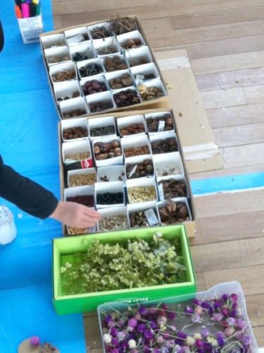 材料の木の実やドライフラワーです。千日紅は羽曳が丘3丁目町会さんよりいただきました。ありがとうございました。