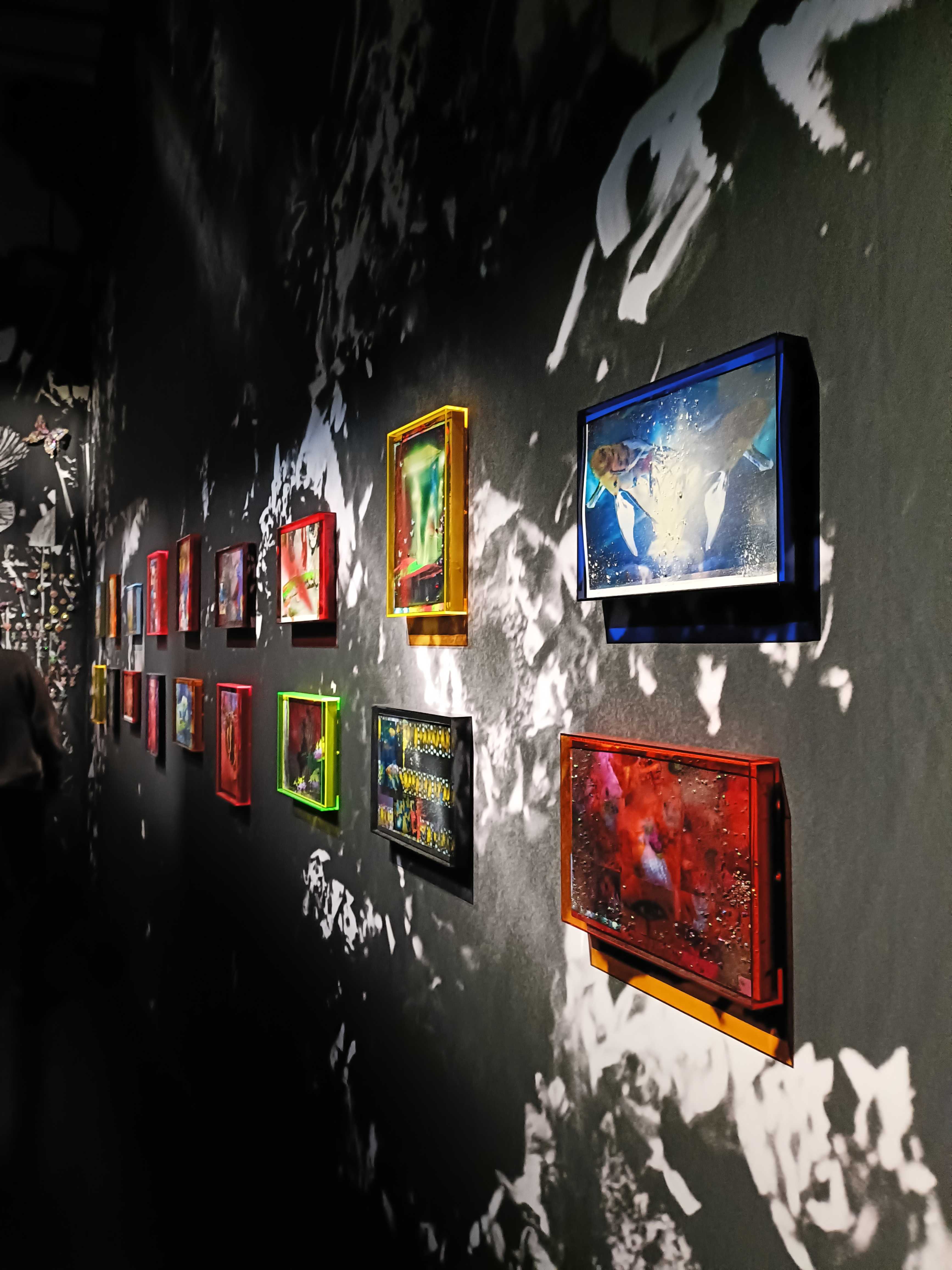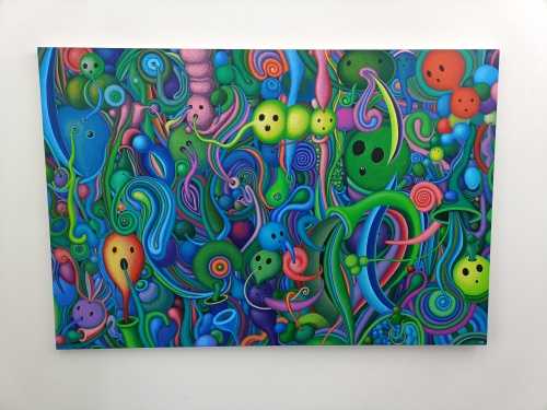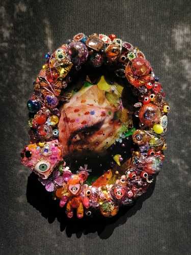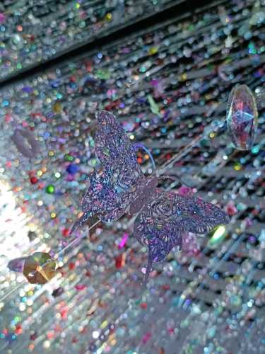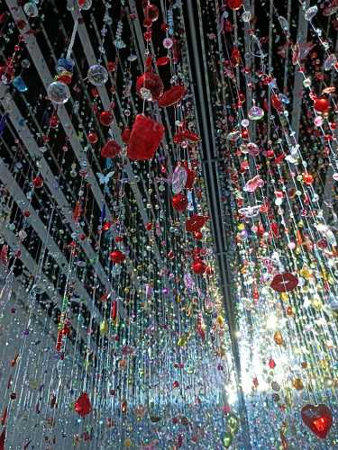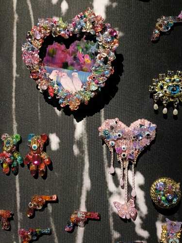 万華鏡のような鮮やかで多色な世界に目を奪われますが、そこに独自の死生観が混ざり合い、「綺麗だね」では終わらない何かが存在しています。ハンドメイドのキッチュなジュエリーをゴテゴテとくっつけたオブジェ。その制作時間はいかほどのものか。無数の糸に取り付けたこれまた無数のキラキラオブジェ。気の遠くなるような仕事量。造花によるインスタレーションも圧倒的な量と色で生を表現しきってしまうところが凄かったです。
