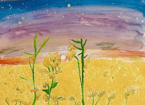 俳句からイメージした絵です。「菜の花や月は東に日は西に」