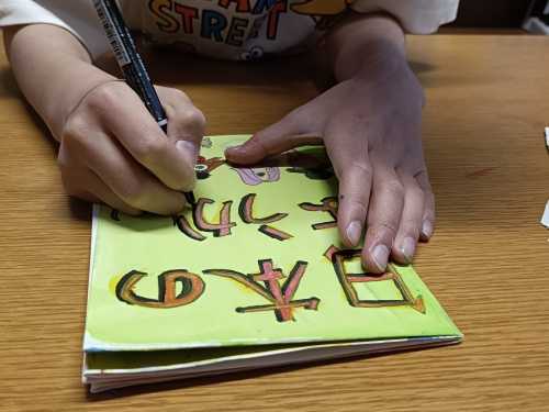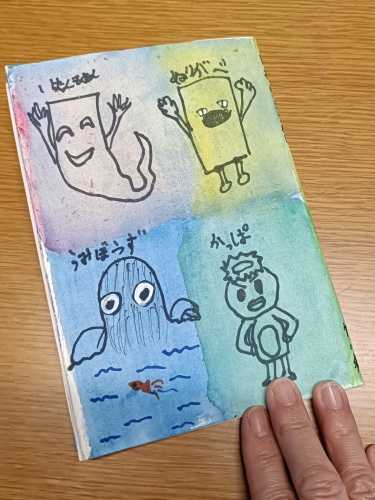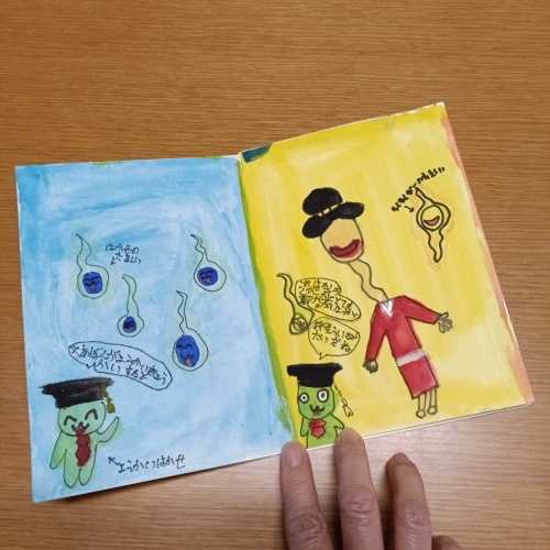 真っ白な冊子に自分なりの絵本を描きます。といってもなかなかお話が浮かばない人は、図鑑でもよいでしょう。絵とそれに添える言葉を考えます。