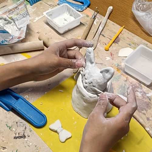 重量感のある紙粘土を使って入れ物を作ります。基本的に紐づくりで入れる部分を作り、蓋はデザインを工夫して面白い入れ物を作ってみよう。
