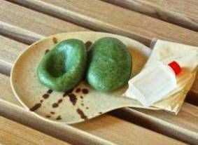 直径3センチほどの米粉だんごで、外側に小豆餡と、白色の漉し餡をつけたのと、うぐいす色(または黄色)の求肥で、味噌餡を包んだのと三種類がある。