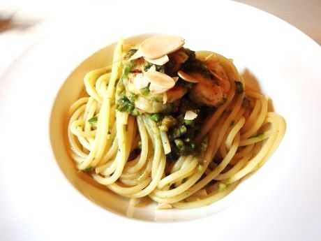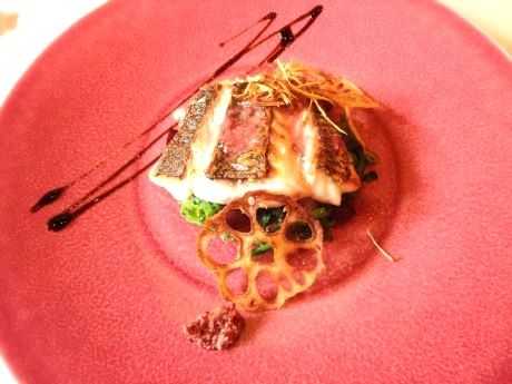~フキノトウとエビのパスタ~鯛のラズベリーソース桜マスタード添え~