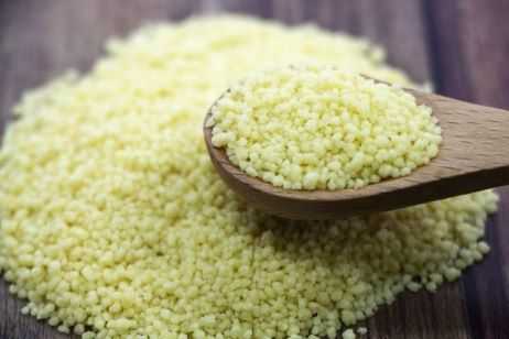 パスタの原料として知られる粉末状にしたデュラム小麦に水を加えて粒状にし、いったん蒸してから乾燥させたものです。