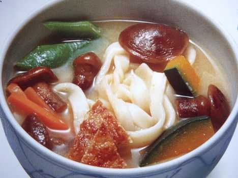 煮干しで取った出し汁に、味噌5,しょうゆ2の割合で味を調え、さらにみりんを加えたら、うどんと野菜類と鶏肉油揚げを入れ、10分ほど中火で煮込んで出来上がり!![]()