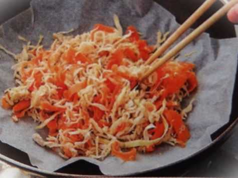 材料:切り干し大根 30 g、鶏ささみ缶1缶、人参中 1/2 本、水大さじ2、おろししょうがチューブ入り少々、ウスターソース大さじ1~2,あれば青のり少々。