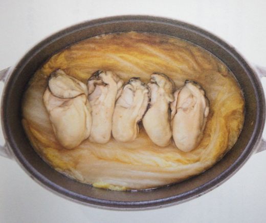 その鍋の中の白菜の上に、よく洗った生食用の牡蛎をのせ、フタをしてさらに 10 分ほど火にかける。