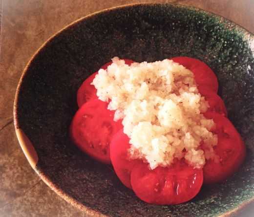 材料(2~3人分):トマト完熟2個、玉ねぎドレッシング(玉ねぎ大1個、植物油・米酢各適量、塩・こしょう各少々) ​​