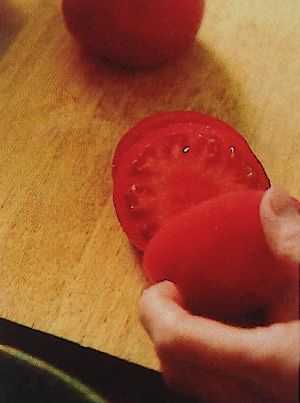 トマトは横に輪切りにする。 そのほうがドレッシングがなじみやすい。ドレッシングと混ぜてマリネにしても…