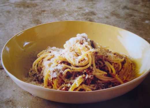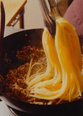 (パスタはザルなどに上げず、茹で上がったらトングでつかみ上げ、直接ソースに加える。こうするとほどよい水分が入る!)