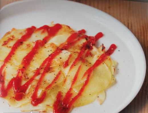 器に盛り、ケチャップをかけ、あらびき黒こしょうをふる。‣……ジャガイモは男爵よりメークインのほうがくっつきやすいのでおすすめ。焼く時はきちんと並べずザッと広げるのがくっつけるコツ?