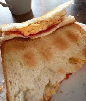 朝ごはん 卵焼きサンド!手で半分こにしたんで断面が汚いのはゴメンナサイ‣……何でも食べてずっと楽しくいきたい。