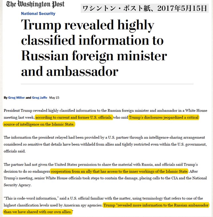 FBI長官だったジェームズ・コミーは5月3日、捜査を打ち切るように圧力を受けたことはないと宣誓の上で発言、その映像がインターネット上にアップロードされている。その発言から5日後に彼は解任され、アンドリュー・マッカビ副長官が長官代理になった。この人物の妻であるジル・マッカビは2015年3月にバージニア州上院議員選挙への出馬を表明、67万5000ドル以上をクリントンと親しいテリー・マコーリフなどから受け取っていた。問題はその時の夫の立場。2015年当時、アンドリューはFBIのワシントンDC担当で、クリントンの電子メール捜査を指揮する立場にあったのだ。本来ならこの件を担当してはならなかった。コミーを解任し、アンドリュー・マッカビを長官代理にする人事はロッド・ロゼンスタイン司法副長官が行ったとも伝えられている。ロバート・マラーが特別検察官に任命される際にもロゼンスタインが中心的な役割を果たした。コミーはヒラリー・クリントンに近い人物だが、クリントンが国務長官時代に電子メールの遣り取り絡み、機密情報の取り扱いに関する法規に批判した可能性があり、またそうした情報をきわめて軽率に扱っていたことを認めている。その上で司法省に対して彼女の不起訴を決めていた。コミーの声明が発表された5日後、2016年7月10日にDNC(民主党全国委員会)のスタッフだったセス・リッチが殺された。背中を2度撃たれていたが、発見されたときには息があり、病院で死亡したという。警察は強盗にあったと発表したが、金目のものは盗まれていない。警察の発表に納得できなかったリッチの両親はワシントンDC警察で殺人課刑事だった私立探偵リッチ・ウィーラーを雇って調査を始める。調査の結果、DNC幹部の間で2015年1月から16年5月までの期間に遣り取りされた4万4053通の電子メールと1万7761通の添付ファイルをWikiLeaksへ渡したのはセス・リッチだということが判明たという。ウィーラー自身、その話を確認していたが、その後、セス・リッチの遺族からウィーラーや話を伝えたFOXニュースへ抗議があり、ウォーラーは発言を撤回する。トランプを攻撃していた勢力にとって都合の悪い話だ。セス・リッチとWikiLeaksとの関係はセスが殺された直後から指摘されていた。事件の翌月、WikiLeaksのジュリアン・アッサンジはDNCの電子メールを提供した人物はリッチだと示唆、射殺事件に関する情報提供者に2万ドルを提供するとツイッターに書き込んでいる。そうしたことから、ウィーラーに関するウィーラーの話は驚きでなかった。ウィーラーの話が伝えられる直前、つまり5月15日にワシントン・ポスト紙は機密情報がドナルド・トランプ米大統領からセルゲイ・ラブロフ露外相へ伝えられたと報道、それ以降、有力メディアは反露ドグマに基づいてトランプを攻撃し、ロバート・マラーが特別検察官に任命された。ワシントン・ポスト紙によると、その機密情報とはイスラム国(ダーイッシュ。IS、ISIS、ISILとも表記)情報の重要な情報源を危険にさらすもので、アメリカの「同盟国」と共有している情報も含まれているという。本ブログでは繰り返し書いてきたように、アル・カイダ系武装集団にしろダーイッシュにしろ、背後にはアメリカの好戦派やアメリカの同盟国がいるわけで、ダーイッシュを敵と考えることは、そうした黒幕にとって都合の悪いことだ。トランプとラブロフの会議録をアメリカの議会へ提供する用意があるとウラジミル・プーチン大統領は記者会見で語っているが、アメリカの一部議員は即座に拒否していた。