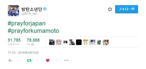 熊本県、大分県九州・中国地方で震災に遭われた方々に心よりお見舞い申し上げます。방탄소년단 防弾少年団 BTS고마워요、ありがとう(;_;)防弾少年団が Twitter で送ってくれた日本へのメッセージ #PrayForJapan が約半日で50,000 RT 以上。韓国のファンから徐々に広がっていった。5年前の東日本大震災の際も多くのK-Pop アーティストたちに励まされたことを思い出す...K-Pop アーティストたちの励ましの言葉韓国から被災地へ行く言葉が美しければ来る言葉も美しい가는 말이 고와야 오는 말이 곱다 韓国から被災地へ。 2012年も君の心で花は咲くto be continued...!?buzz KOREAClick...にほんブログ村 韓国映画にほんブログ村 映画にほんブログ村 映画評論・レビューにほんブログ村 韓国情報にほんブログ村 K-POPにほんブログ村Copyright 2003-2026 Dalnara, confuoco. All rights reserved.本ブログ、サイトの全部或いは一部を引用、言及する際は著作権法に基づき出典(ブログ名とURL)を明記してください。無断で本ブログ、サイトの全部あるいは一部、表現や情報、意見、解釈、考察、解説ロジックや発想(アイデア)・視点(着眼点)、写真・画像等もコピー・利用・流用・盗用することは禁止します。剽窃厳禁。悪質なキュレーション Curation 型剽窃、つまみ食い剽窃もお断り。複製のみならず、ベース下敷きにし、語尾や文体などを変えた剽窃、リライト、切り刻んで翻案等も著作権侵害です。